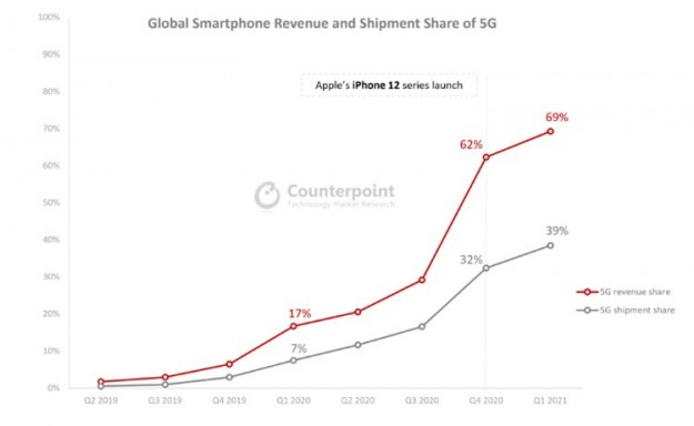 Смартфоны с 5G генерируют почти 70 % выручки на глобальном рынкеКомпания Counterpoint Technology Market Research обнародовала любопытную статистику по глобальному рынку смартфонов с поддержкой мобильной связи пятого поколения (5G).