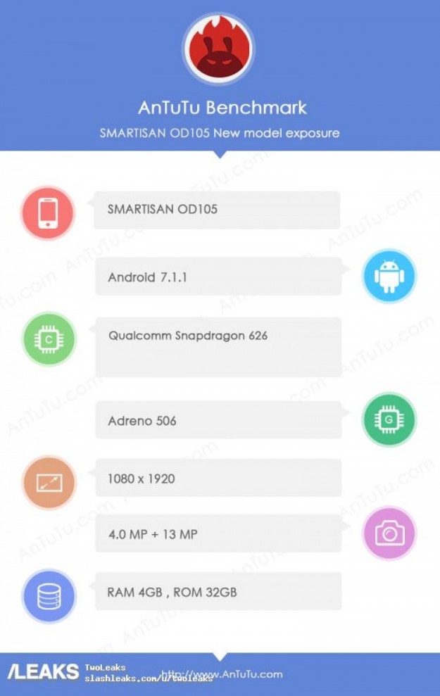 Smartisan OD105 с 4 ГБ ОЗУ и Android 7.1.1 замечен в AnTuTuВ базе данных бенчмарка AnTuTu засветился новый смартфон китайской компания Smartisan с индексом OD105, спецификации которого намекают на принадлежность к среднему ценовому сегменту.