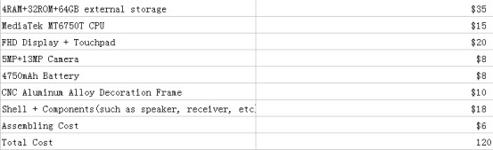 Согласно цене на компоненты, которые мы оценили внутри смартфона, стоимость собранного U300 должна достигать не менее 120 долларов. Сюда относятся материальные затраты и расходы на сборку. Стоимость памяти $35 (4ГБ ОЗУ + 32ГБ встроенной), $20 - FHD-дисплей плюс тачпад, $15 - MediaTek MT6750T, $8 - аккумулятор (4750 мАч) и т. д. Кроме того, стоимость сборки составляет 6 долларов.