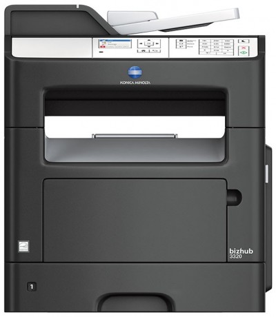 - Konica Minolta bizhub 3320 – 390 грн в месяц. Позволяет печатать и сканировать документы формата А4. Разрешение и качество печати понравится – 1200х1200 dpi. Работает он быстро и выдает до 33 страниц в минуту. Рекомендуемая производителем плотность бумаги – 163 грамма на метр квадратный. Самый большой минус этого МФУ – печать только в черном и оттенках серого. А если хочется цветного? Тогда платим больше – ровно в 2 раза больше.