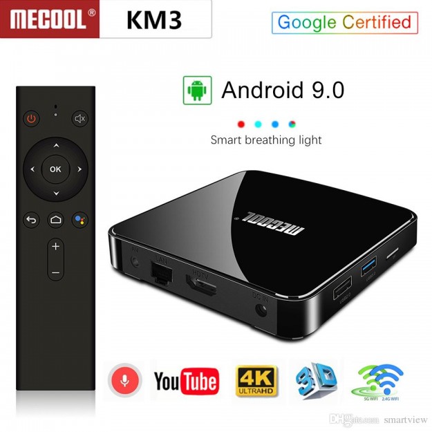 - MECOOL KM3 – устройство на новой Android 9.0 с сертификацией от Google. Внутри актуальный чипсет Amlogic S905X2 на 8-х ядрах Cortex-A53. Дополняют его 4 ГБ оперативной памяти и 64 ГБ встроенной. Хранилище расширяется карточками microSD до 128 ГБ. На выходе поддерживается звучание в формате 5.1. Для подключения и синхронизации задействованы порты: HDMI 2.0, RJ45. Wi-Fi работает на частотах 2,4 и 5 ГГц. Программная часть в сочетании с железом MECOOL KM3 способным воспроизводить видео в 4K формате. Устройство идеально подойдет для домашнего использования, но покажет себя в лучшем виде только на современных телевизорах с диагональю от 42 дюймов и разрешением от FullHD.