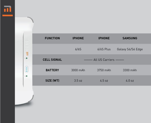 Но даже это еще далеко не все достоинства mJoose. Чехол ко всему прочему оснащен еще и встроенным аккумулятором емкостью от 3000 до 3750 мАч в зависимости от модели поддерживаемого смартфона: 3000 мАч для Apple iPhone 6 и 6S, 3750 мАч для iPhone 6 Plus и 6S Plus, 3300 мАч для Samsung Galaxy S6 и S6 Edge. Да, к сожалению, количество поддерживаемых мобильных устройств пока ограничено и сводится лишь к флагманским девайсам топовых производителей. Но, возможно, со временем, если продажи новинки будут успешными, список устройств пополнится новыми моделями, в том числе бюджетного сегмента.