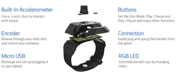 Новинка представляет собой тонкие и легкие смарт-перчатки из двухслойного эластичного спандекса, которые оснащены восьмью датчиками движения, быстро и четко реагирующими на минимальные изменения в положении пальцев пользователя и превращающих их затем в музыку.