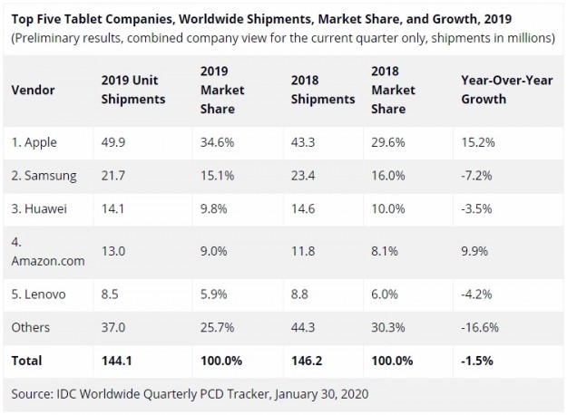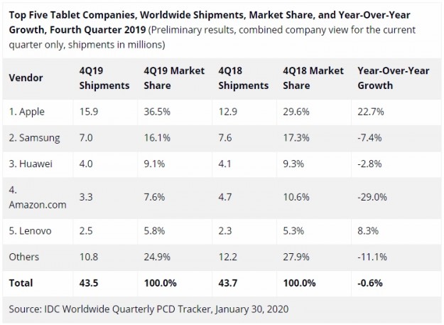За трёхмесячный период отгрузки планшетов составили 43,5 млн штук. Это на 0,6 % меньше результата 2018 года, когда поставки равнялись 43,7 млн единиц. Учитываются продажи как обычных планшетов, так и гаджетов с присоединяемой клавиатурой.