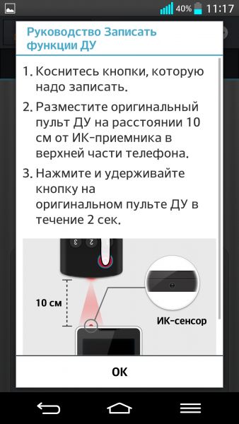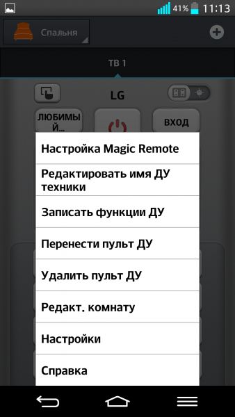После знакомства с категориями продуктов система предложит выбрать комнату, в которой будет использоваться этот «пульт». Очевидно, функциональность рассматриваемого приложения некой мерой зависит от архитектурных особенностей того или иного помещения. К слову, что приятно, если вы настроили пульт для телевизора, скажем, на кухне, «перенести» его в спальню проблем не составит - предусмотрена специальная опция. Как тольковыбран тип комнаты, в которой он планирует использовать данный пульт ДУ, нажатием на кнопку в виде крестика справа можно выбрать устройство, для которого настраивается «управленец». Всего здесь семь категорий продуктов. Кроме того, и, на мой взгляд, это плюс, пользователь имеет возможность настроить свой «Универсальный пульт ДУ»благодаря простому и очень удобному мастеру. Выбрав необходимую категорию устройств, переходим к выбору производителя. Все они сведены в отдельный каталог. Далее необходимо настроить этот «пульт». К слову, независимо от выбора в той или иной категории электроники эта часть настроек осуществляется в два-три клика. Далее становится доступным полноценный пульт дистанционного управления. После всего этого, перейдя в контекстное меню, пользователь получает возможность редактировать имя пульта, то есть изначальное «ТВ1» переименовать на свое усмотрение. Кроме того, здесь же можно «Записать функции пульта дистанционного управления», «Удалить пульт», «Перенести пульт» - сменить комнату, не меняя настроек для выбранной единицы электроники и мн. др. Приятно также и то, что пользователь может настроить несколько пультов под различную электронику. В конечном итоге перед нами интересное приложение, способное заменить целый ворох пультов дистанционного управления как дома, так и на работе. На стороне его удобная настройка, универсальность для любой электроники плюс стабильность работы. Джерело: SmartPhone.ua Обговорення новиниГость: класс где скачать бека: где скачать надо Гость: ГДЕ СКАЧАТЬ?????? сегей где скачать Лана: Где скачать??? Гость: Где скачать Гость: Где скачать? Гость: Где скачать Гость: где скачать Алишер: Где скачать Гость: А у меня и так есть роман А что у тя за модель роман: У меня lg g3 немогу негде скачать помогите роман: кто поможет положу на телефо 399 рублей роман: пацан у которого она есть а ты есть в вконтакте Влад: для начала нужно иметь в телефоне,планшете ик порт , пользуюсь LG V500 еще не подвел Sam: что вы тут пишите про ИК?!знаете где её взять или нет? Алексей: Вы ее нигде не скачаете. Можно извлечь из прошивки, но даже если и установите, она не будет работать. На моем LG L90 она не установилась. Кто хочет поэкспериментировать ответьте. Алексей: P.S. Она у меня есть, кому надо могу скинуть ссылку Veronika Алексей, можно ссылку получить олег Нада скинь Гость Скинь ссылку плиз, сюда http://vk.com/id310469634 Viorika Пожалуйста ссылку сюда http://vk.com/viorika_831 Буду очень благодарна caня Скинь пж Маня: Подскажите, как удалить с заставки? Всё перетыкала - при блокировке экрана всё равно остаётся. Гость: Алексей скинь ссылку Veronika: Можно ссылку Гость: * wкак скачать tema: Дайте ссылку Артём: Ссылку можно пожалуйсто олег: Так а где сылка ааааа Руслан: Можно ссылку Егор: "Интерфейс LG Quick Remote прост и понятен даже для не очень сведущих в электронике пользователей. Перейдя в главное меню, первое, с чем придется ознакомиться, - перечень категори