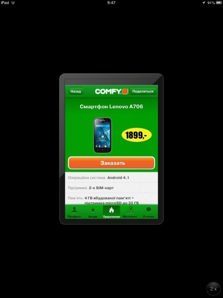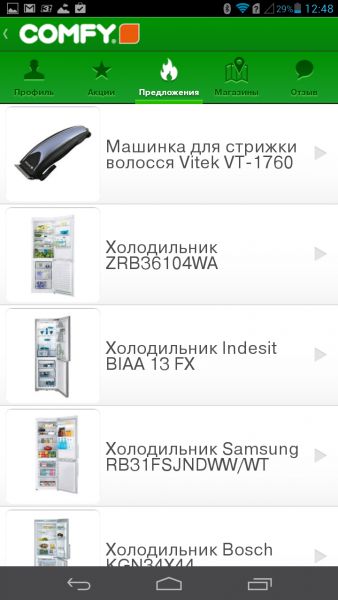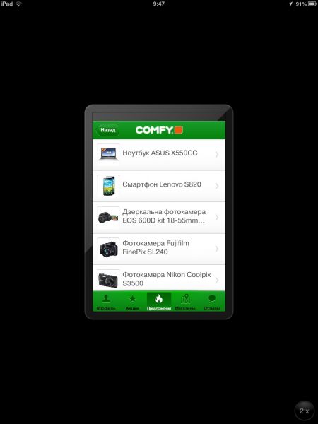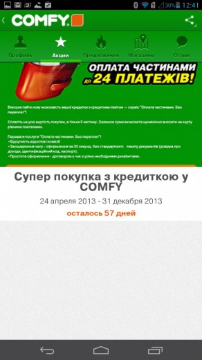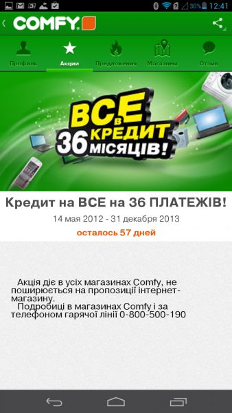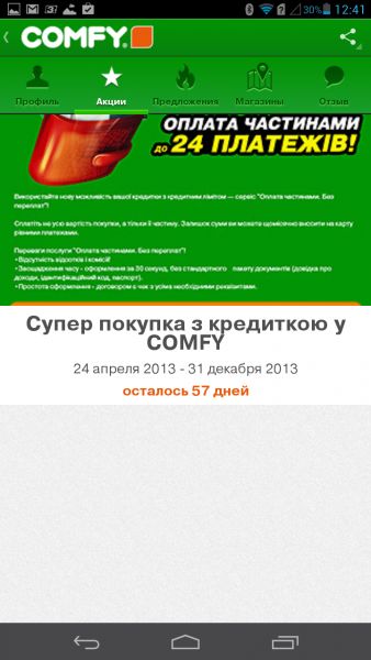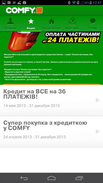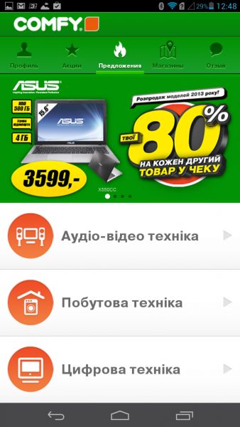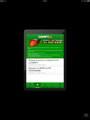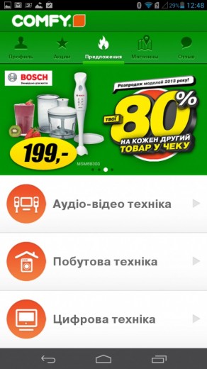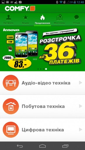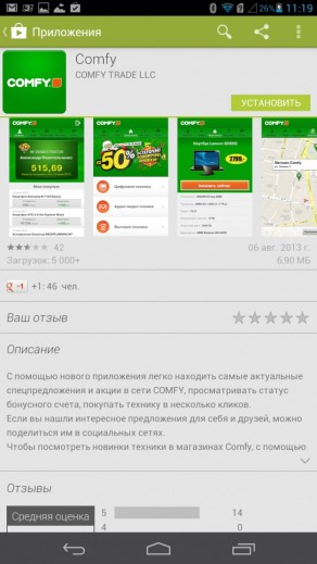 Софтовый калейдоскоп! Приложение от магазина - Comfy TRADE LLCМобильнее решение для платформы Android и iOS от сети супермаркетов электроники Comfy. Согласно официальным данным, с его помощью можно быть в курсе самых актуальных новинок в сети одноименных магазинов, просматривать статус бонусного счета, покупать технику всего в пару кликов и многое другое. Посмотрим же приложение в действии. Данная статья подготовлена с использованием смартфона Huawei Ascend Mate, с детальными спецификациями которого вы можете ознакомиться по этой ссылке. Вместо вступления. Альтернатива под iOS Comfy TRADE LLC под платформу iOS в магазине App Store отыскалось на удивление легко. Правда, на данный момент оптимизировано оно только для смартфонов iPhone и плееров iPod. Кроме того, производитель говорит, что с ним можно работать и на планшете iPad. Проверил - можно. Но выглядит это не очень красиво. Все же оптимизация под iPad, на мой взгляд, лишней бы не была. Интерфейс приложения как под iOS, так и под Android одинаков. Объем дистрибутива и условия распространения Под Android, впрочем, как и под iOS, данное приложение распространяется совершенно бесплатно. Объем дистрибутива около 7 МБ. Таким образом, даже если вы будете использовать EDGE, загрузка много времени не займет. Вот, кстати, ссылка. Возможности Интерфейс меню прост. Состоит он из пяти подпунктов меню: «Профиль», «Акции», а также «Предложения», «Магазины» и «Отзыв». Первое из подменю это своего рода клуб покупателей сети Comfy, которые обладают бонусной карточкой или же хотят, скажем так, стать участником этого клуба. Кстати, для последнего необходимо выполнить всего «четыре шага»: купить товар на 500 гривен и более, найти цифровой код на чеке, отправить его на быстрый номер и активировать бонусную карту. Что дает эта карточка!? Ну, во-первых, и, наверное, самое главное - возможность просматривать баланс бонусного счета. Кроме того, владельцы карт автоматически получают уведомления о новых акциях Comfy и пр. Впрочем, о последних могут узнать не только участники «клуба», но и просто все желающие, хотя бы уже потому, что в этом приложении вторым подменю выступает именно «Акции». Подменю «Предложения» оформлено по такому же формату, как и раздел «Каталог» в приложении «Фокстрот. Техника для дома», с тем только отличием, что в последнем лучше реализована рубрикация товаров - она не выглядит столь запутанной, как это в свою очередь сделано в Comfy TRADE LLC. Все дело в том, что здесь все три направления, что довольно неудобно, а кроме того, нет поиска - по крайней мере, для незарегистрированных пользователей. Таким образом, просматривая телевизоры, вы можете «наткнуться» на аксессуары к ним, которые вы не ищете, но которые система вам предлагает. Подменю «Магазины» - это карта плюс адреса супермаркетов. А последнее «Отзыв», на мой взгляд, говорит само за себя. Единственное, что стоит отметить, для того, чтобы добавить отзыв, нужно быть зарегистрированным пользователем. Некоторые выводы Приложение Comfy TRADE LLC выглядит довольно интересным, но идеальным его пока не назовешь. Отсутствие поиска, несовершенная рубрикация предлагаемого товара не делают его 100% комфортным для пользователя, хотя, если вам нравится сервис и цены этой сети, эта программа лишней не будет. Сергей Решодько Джерело: SmartPhone.ua Обговорення новиниКоментариев пока никто не оставил. Станьте первым! Попередні нови