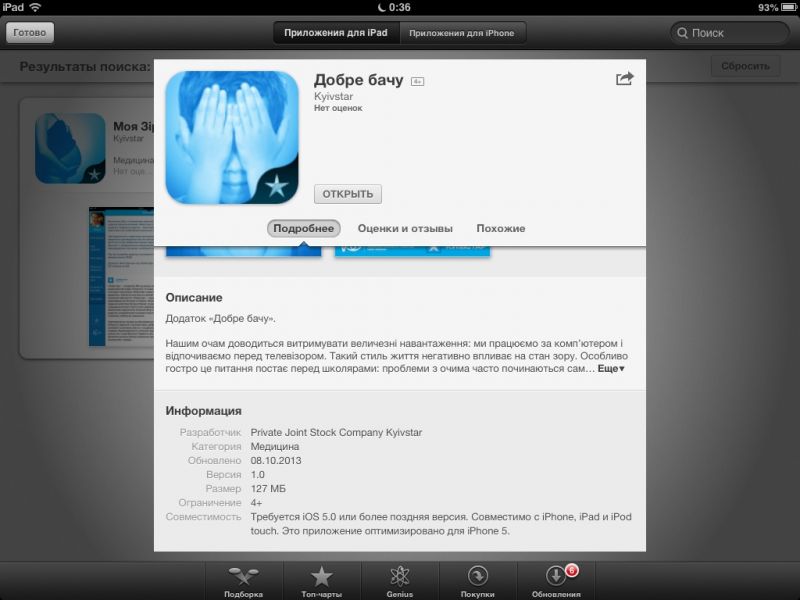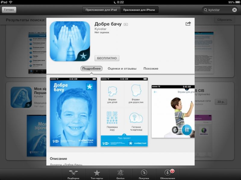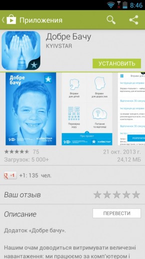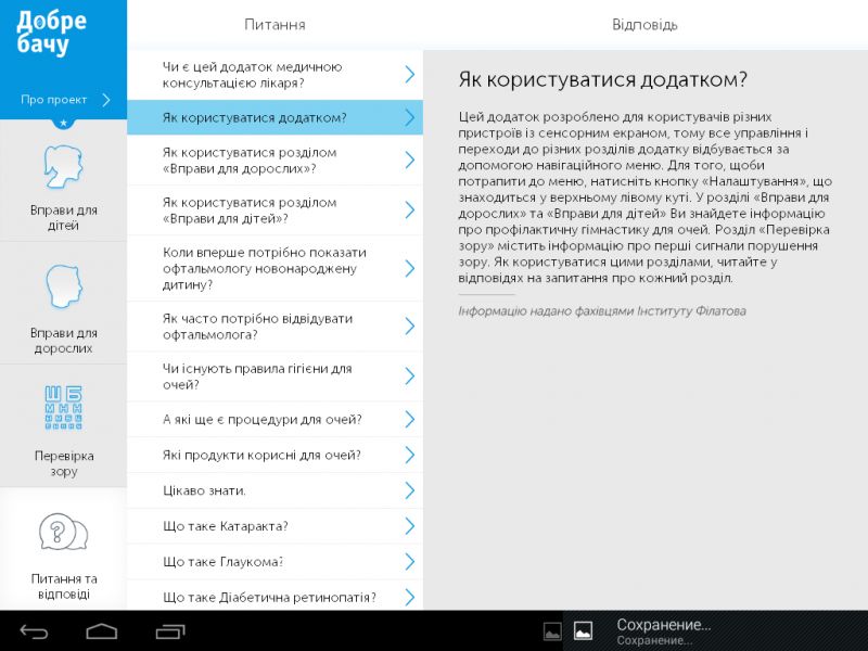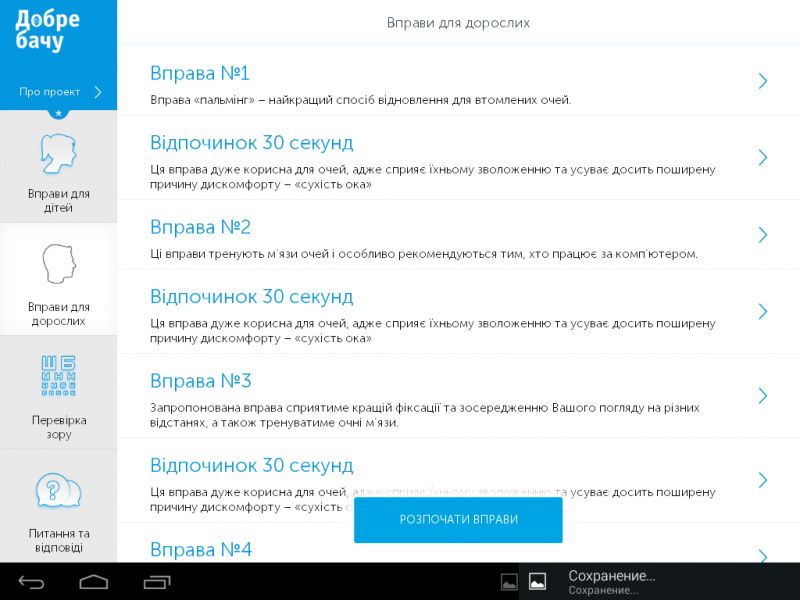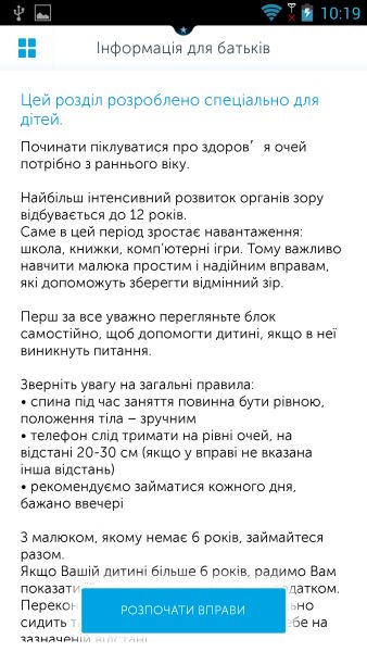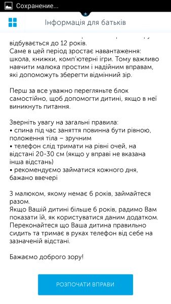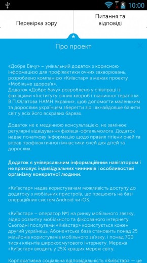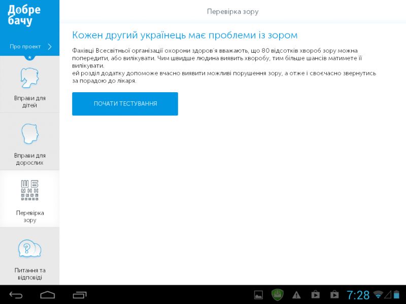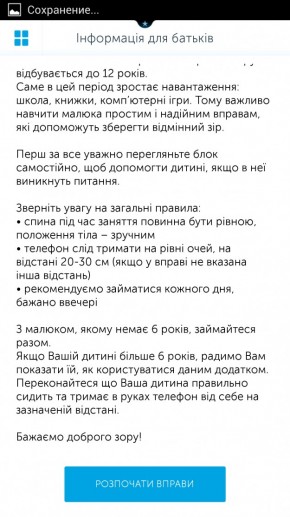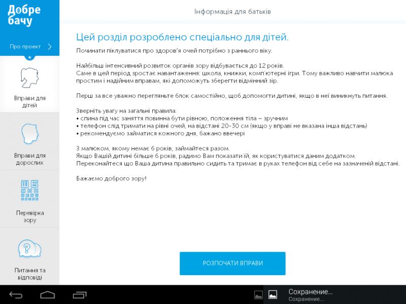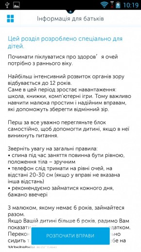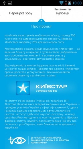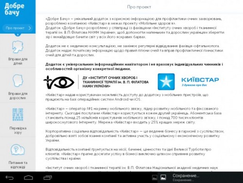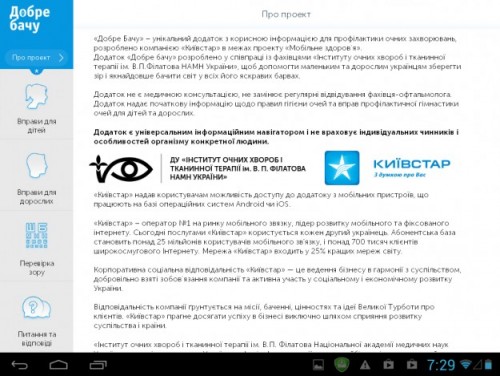 Софтовый калейдоскоп! Приложение от оператора - «Добре бачу»Несколько недель назад в Одессе состоялась презентация приложения «Добре бачу», созданного оператором «Киевстар» и Институтом глазных болезней и тканевой терапии имени Филатова. Как и обещали ранее, сегодня мы знакомим с его особенностями. Статья подготовлена с использованием смартфона Lenovo K900, с детальным обзором которого можно ознакомиться здесь. Вместо вступления На момент выхода этой новости мы лишь упомянули о существовании версии приложения для устройств под iOS, однако более детально на этом не останавливались. Все дело в том, что хотя во время презентации говорилось о существовании такой версии, однако в App Store, даже на следующий день, мне не удалось увидеть это приложение. Именно потому решено было не упоминать до появления. На момент написания этого обзора приложение «Добре бачу» уже было доступно и под эту платформу. О версии для планшетов и смартфонов Вообще стоит отметить, что изначально при соответствующем поисковом запросе в Google Play в строке выдачи отображались два вида приложения с, по сути, одинаковым названием плюс приставкой HD в одном из них. Именно то, которое получило упомянутую приставку, является оптимизированным под планшеты. Ну а то, что без приставки HD, под смартфоны. Далее буквально пара иллюстраций, как выглядит планшетная версия приложения. Дистрибутив и загрузка Независимо от того, какую версию приложения вы будете загружать, обе они бесплатные. Об этом говорилось еще на самой презентации, и об этом отмечено в Google Play. Кроме того, приятно, что приложение не содержит рекламы. Впрочем, учитывая социальную ориентацию проекта, врядли стоило бы ожидать другое. После установки, которая занимает около минутыи зависит только от скорости вашего Wi-Fi, можно начинать знакомиться с приложением детальнее. Интерфейс и возможности Меню приложения достаточно простое и понятное уже с первых минут знакомства. Пользователь получает доступ к четырем большим подменю, а также техническому разделу «О проекте». Последнее дает полную справку о том, для чего/кого разработано данное приложение. Главное же меню состоит из «Упражнений для взрослых», «Упражнений для детей», а также «Проверка зрения» плюс «Вопросы и ответы». Первое из этих подменю представлено пятью упражнениями и таким же количеством заданий для отдыха, которые рекомендуется проделывать после основных. Здесь все очень удобно и не последней мерой благодаря наличию видео подсказок. Подменю «Упражнения для детей» встретит пользователя информацией для родителей. Здесь небольшая инструкция последним, как именно должен вести себя ребенок, работая с этим приложением. Далее все происходит в формате фильма, где зрителю нужно всего лишь следить за подсказками на видео, не более того. «Проверка зрения» - содержит в себе два теста, позволяющие мобильно проверить зрения. По времени занимает несколько минут и при условии четкого соблюдения инструкции, согласно заверению создателей приложения, пользователь получит точный результат. Ну и последнее подменю «Вопросы и ответы» сориентирует пользователя в наиболее важных вопросах касательно работы с приложением, а также профилактики зрения, полезных продуктах для зрения и многих других вопросах, касающихся офтальмологии. Вывод Очень простое и удобное прило