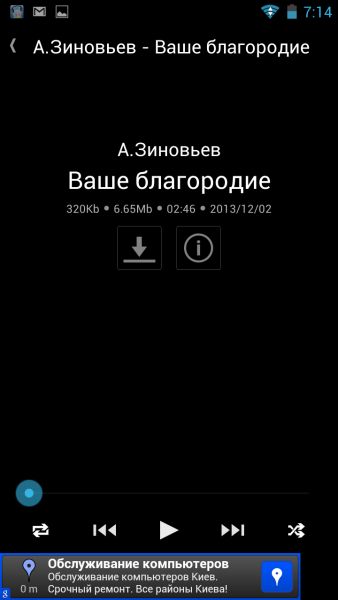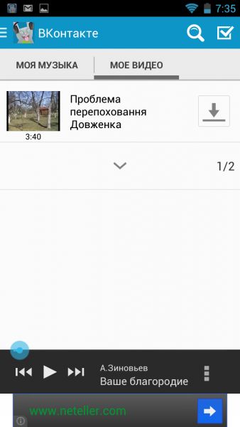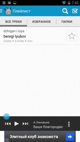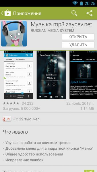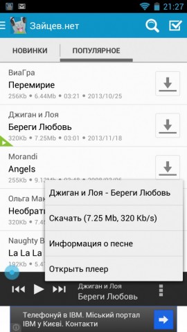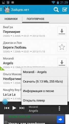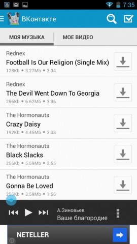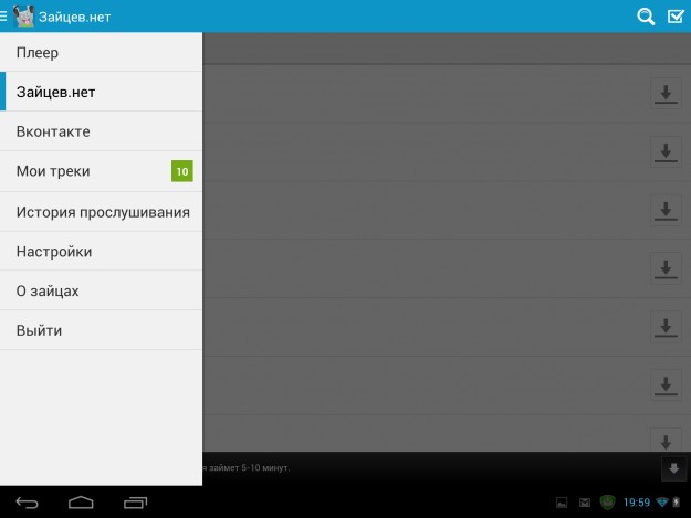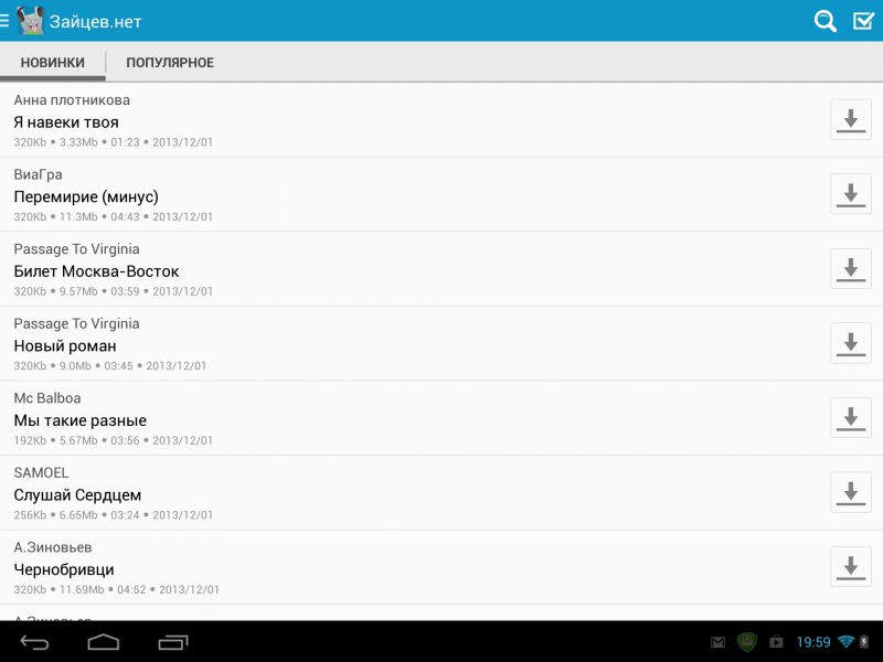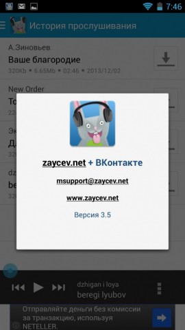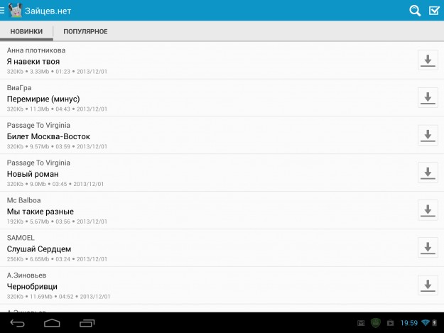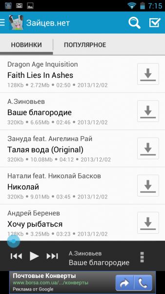 Софтовый калейдоскоп! Приложение от разработчика - «Музыка mp3 zaycev.net»Клиент для устройств на Android популярного музыкального сервиса. Насколько удобен в пользовании? Все «плюсы» и «минусы»! Статья подготовлена с использованием смартфона Huawei Ascend Mate. Здесь детальный обзор устройства. Вместо вступления Zaycev.net - сервис далеко не молодой, назвать его стартапом при всем желании не получится. Возник еще до появления Vkontakte с его возможностями по части оформления музыкальных каталогов на пользовательском уровне. На сегодня уже силами владельцев «зайцев» разработаны клиенты для платформ Android и Windows Phone. Обо всем этом свидетельствует соответствующая информация на сайте. Для iOS по крайней мере, пока что нет. К сожалению, в силу технических обстоятельств у меня не было возможности посмотреть, как выглядит приложение под платформу Windows Phone, а потому предлагаю ссылку на официальную страничку клиента. А вот так выглядит клиент на планшете под Android. Забегая наперед, отмечу, функциональность та же. Формат распространения и объем дистрибутива В магазине Google Play «Музыка mp3 zaycev.net» распространяется на бесплатных условиях. Объем файла немного больше одного мегабайта. Содержится небольшой рекламный блок. Впрочем, сказать, что последний мешает пользователю, нельзя. Интерфейс и возможности После перехода в главное меню пользователя ждут два подраздела «Новинки» и «Популярное». Перед нами, образно говоря, чарты. Приятно, что как в первом, так и втором имеется возможность загрузки трека. Его затем, конечно же, можно воспроизвести без подключения смартфона к Сети. Для того, чтобы осуществить загрузку, необходимо лишь нажать на иконку со стрелкой вниз. Ну а если пользователь захочет проиграть трек в потоковом режиме, для этого достаточно лишь нажать на саму композицию - в самом низу диалогового окна появится небольшой плеер и начнется воспроизведение. Кстати, во время проигрывания пользователь может узнать объем файла, а также битрейд. Кроме того, из этого же подменю доступна информация о песне (исполнитель и текст). Да, упомянутый плеер можно развернуть на весь экран. В таком положении его пользователь также может узнать об исполнителе, посмотреть текст песни и пр. Вверху главного меню расположены три окошка. Одно из них - «Поиск» позволяет найти интересующий трек на сайте. Другое, изображенное в форме квадратика с галочкой, любопытно тем, что разрешает создавать некоего рода плейлист из присутствующих в том или ином каталоге композиций. Проще говоря, пользователь сам выделяет треки, которые будут проигрываться один за другим. А вот окошко, именуемое как «Зайцев.нет», «переводит» в еще один большой раздел, состоящий из восьми подпунктов: «Плеер», Ззайцев.нет», «Вконтакте», «Мои треки», а также «История прослушивания», «Настройки», «О зайцах» и «Выйти». Первое - тот же плеер, что мы встречали ранее. Второй - перевод пользователя в главное меню. С точки зрения эргономики решение оправданное. Любопытным оказался подпункт Вконтакте. Здесь, пройдя авторизацию, можно загрузить аудио и видео со своей страницы в память смартфона/планшета. «Мои треки». Отсюда открывается доступ к загруженным пользователям композициям, трекам, отмеченным как «избранные» и пр. Здесь же можно сортировать сохраненные данные по папкам. «История прослушивания» предоставит доступ к послед