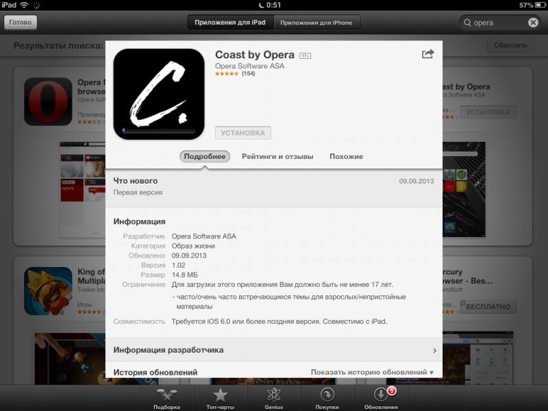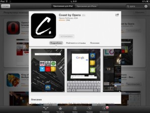 Софтовый калейдоскоп! Приложение от разработчика - Opera CoastСпециальный браузер, ориентированный на работу исключительно с планшетами iPad. Свежее предложение, релиз которого состоялся буквально на прошлой неделе. Давайте же посмотрим, что особенного в нем. Дистрибутив и условия распространения На момент официального анонса браузера, сам дистрибутив уже был готов к распространению и находился в магазине App Store. Формат распространения бесплатный, объем файла загрузки 14,8 МБ. На странице загрузки также пользователь может ознакомиться с особенностями этого браузера, посмотреть несколько иллюстраций интерфейса и многое другое. Интерфейс Интерфейсменю обустроен таким способом, что здесь фактически нет кнопок. Изначально она всего одна – в правом нижнем углу. У этой клавиши несколько функциональных особенностей. Если пользователь пребывает в главном меню, посредством нее можно запустить последнюю сессию. А вот если он находится на какой-либо другой странице, нажатием на эту кнопку можно переключаться между открытыми страницами. Кстати, сама по себе реализация похожа на ту, которая применена в «штатном» браузере Android. Когда пользователь пребывает на каком-либо из сайтов, становится доступной еще одна кнопка. Она реализована на нижней части окна браузера и отвечает за сворачивание окон и переход в главное меню. Интерфейс его – это поисковая строчка с различными фишками, а также закладки последних посещенных пользователем страниц. Количество этих ярлыков можно увеличить или уменьшить, а также сгруппировать по своему усмотрению. Функциональные особенности Поисковая строчка «закреплена» за Google. Что не очень понравилось лично мне, так это то, что в процессе ввода поискового запроса система пытается «угадать» вашу мысль, предлагая автоматически слова к введенному вами слову или фразе. Любопытна и другая особенность. Так, если пользователь вводит в качестве запроса всего лишь одно слово или даже букву, система автоматически «подыщет» несколько сайтов, которые на ее взгляд, соответствуют исковому запросу. Изначально на панели нет ярлыков электронной почты, но их очень легко добавить — достаточно лишь ввести «e-mail» в поисковую строчку. Клиенты социальных сетей система легко отыщет уже по первой букве. В Opera Coast предусмотрен и свой инструментарий для проверки безопасности сайтов. Не вдаваясь в технические подробности его, отмечу лишь, как именно можно это сделать. Пребывая на странице, изначально необходимо нажать на кнопку, позволяющую перейти на другую страницу. После того, как все страницы несколько уменьшаться в размерах, пользователь должен «потянуть» интересующую его страницу к кнопке сворачивания сессии. Специальный редактор, который появится вследствие выполнения такого «маневра», и позволит определить, безопасен сайт или нет. Кстати, после проверки безопасности адрес сайта можно опубликовать у себя на Facebook, Twitter либо же переслать по электронной почте. Удобно и перелистывание «вперед-назад»! Это можно сделать с помощью движения соответствующего движения. И в завершении немного о закладках. В сущности, так отображены последние посещенные страницы пользователем. Никаких лишних «телодвижений» - достаточно лишь нажать на кнопку в самом низу по центру и страничка свернется в свое окошко. Если его еще нет, система автомати