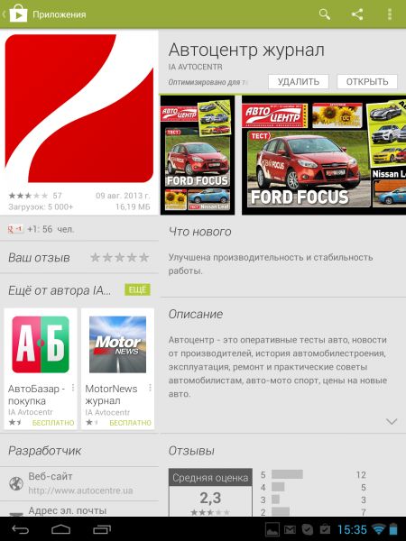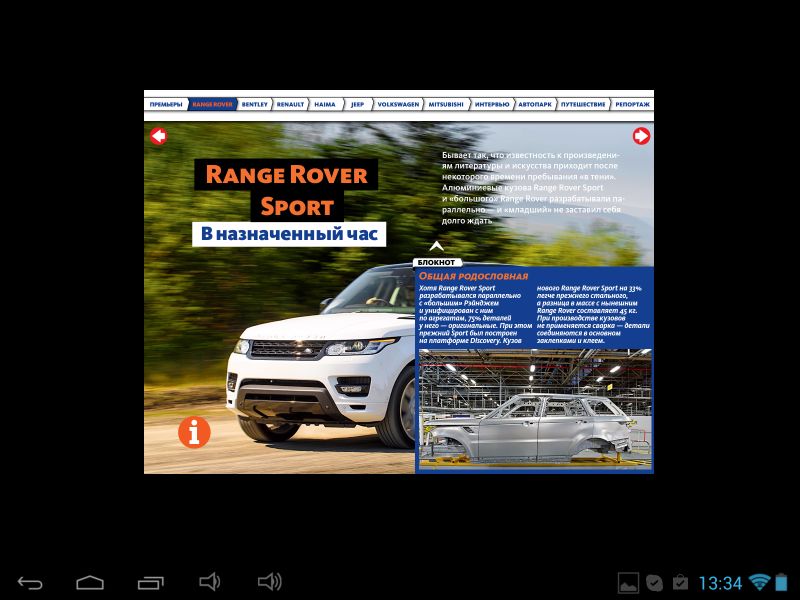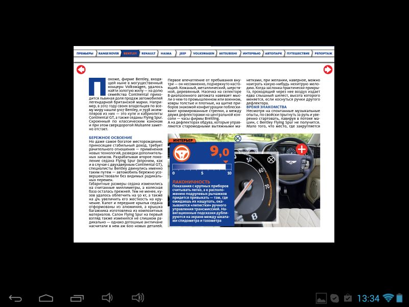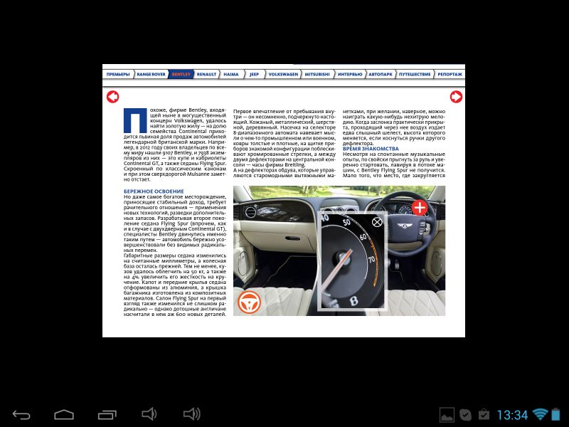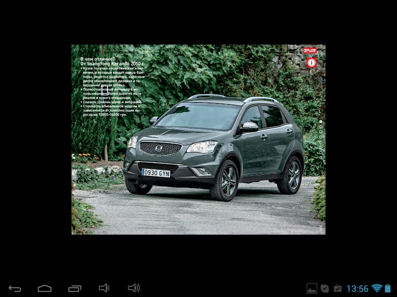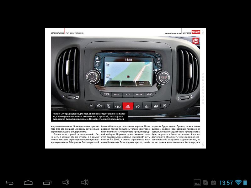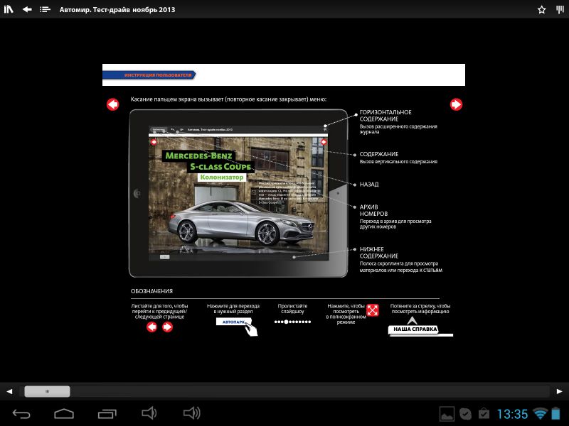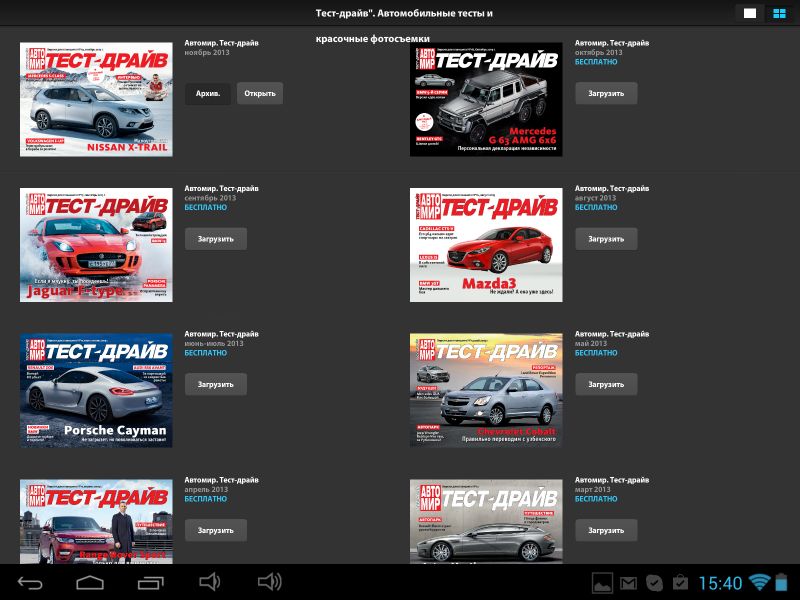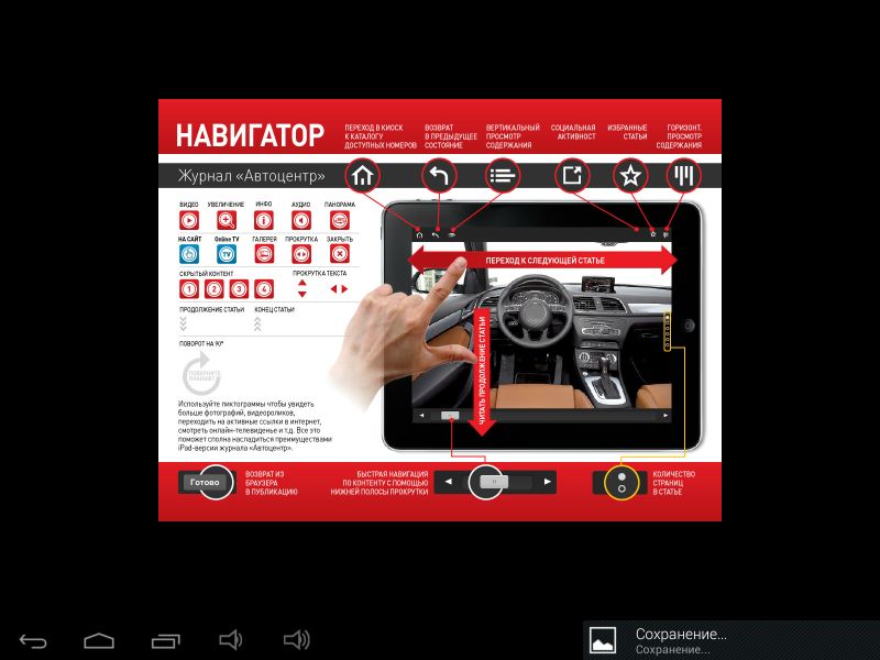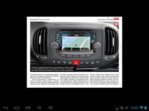 Софтовый калейдоскоп! Приложения от журнальных изданий «Автомир» и «Автоцентр»Автопроизводители все активнее внедряют мобильные устройства в автомобили, в свою очередь смартфоны и планшеты предлагают широкий набор приложений для автомобилистов — как развлекательных, так и информационных, обучающих, помогающих избегать встреч с милицией, искать парковочное место и мн. др. Сегодня рассматриваем бесплатные приложения известных автомобильных изданий «Автомир» и «Автоцентр» для планшетов под управление операционных систем Android и iOS. Данная статья подготовлена с использованием планшета iconBIT NetTAB SPACE QUAD RX, детальный обзор которого здесь. Вместо вступления «Автоцентр» предлагает пользователю единственное приложение «Автоцентр журнал», в то время как издание группы компаний Автомир представлено в Google Play двумя – «Автомир Драйв» и «Автомир Тест-драйв». Все предложенные приложения являются электронными версиями одноименных печатных изданий и предоставляют пользователю весь их контент, а это новости, тест-драйвы новинок и пр. В виде приложений данные издания дополнены анимированными элементами, интернет-ссылками, видео, фотогалереями и прочими мультимедийными «фишками». Количественное сравнение Приложение журнала «Автомир Драйв» в магазине Google Play оказалось самым бедным на контент — в нем представлены лишь 6 журналов (номера с июнь по октябрь), да и то платные. Стоимость одного составляет 1,17 швейцарских франков, порядка 10 грн. Куда богаче на количество доступных для скачивания журналов оказалось приложение «Автоцентр журнал» — в распоряжении пользователя 58 номеров. Впрочем, загрузить бесплатно можно лишь два, а за те, которые платные, придется отдать 0,99 евро. Данная стоимость заявлена как в GooglePlay, так и в AppleStore. В приложении «Автомир Тест-драйв» все журналы доступны бесплатно. Их здесь 19 единиц. Интерфейс приложений Открыв любой загруженный номер журнала, становится сразу понятно, что разработчики данных приложений позаботились о нервах читателей, разместив на второй страничке «Инструкцию пользователя» данной утилиты. В ней детально рассказывается о том, какие пункты меню предусмотрены в приложение и что обозначают те или иные иконки, использующиеся на страницах издания. Отмечу, на 9.7-дюймовом планшете лист журнала размещается по центру, занимая лишь порядка 50% всей площади панели. Открыть его в полноэкранном режиме не получится, как, впрочем, и приблизить. Текст в таком случае достаточно маленький. Уверена, не всем людям будет комфортно его читать. Отображается страница журнала в утилите «Автомир Тест-драйв» лишь в горизонтальной ориентации планшета, в то время как в приложении «Автоцентр журнал» возможно и вертикальное положение. В обоих утилитах Меню программы вызывает касание к дисплею планшета. Затем в верхнем правом углу появляется две иконки. Крайняя правая является вызовом расширенного содержания журнала, а ее «соседка» — подменю «Избранное», куда можно сохранять нужные вам страницы. В левом верхнем углу слева направо разместились клавиша перехода к архиву всех номеров журнала, кнопки «Назад» и вызова вертикального содержания номера, а нажатие на название выпуска переводит пользователя на его первую страницу. На страницах издания пользователь найдет кнопки для просмотра видео, клавиши перелистывания с