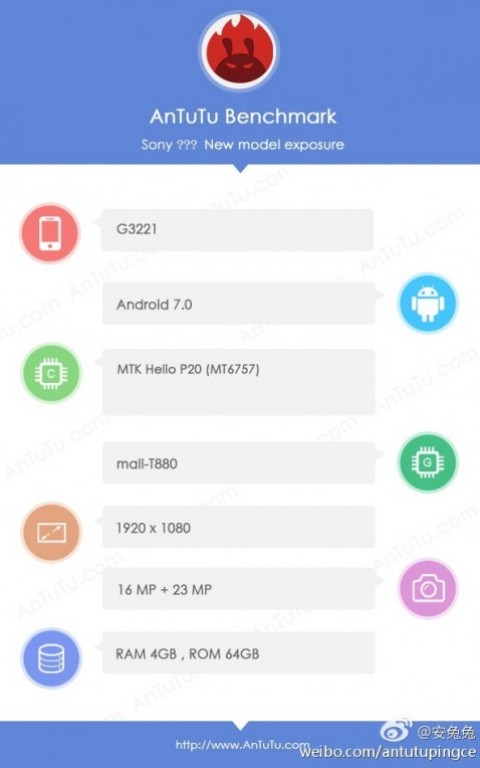 Sony G3221 с 16Мп селфи-камерой и Helio P20 SoC засветился в AnTuTuНе представленный еще официально смартфон Sony G3221 прошел тестирование производительности в бенчмарке AnTuTu. Результат прогона девайса в тестере, к сожалению, узнать так и не удалось, зато стали известны ключевые спецификации модели.