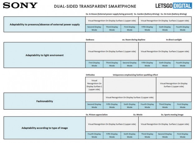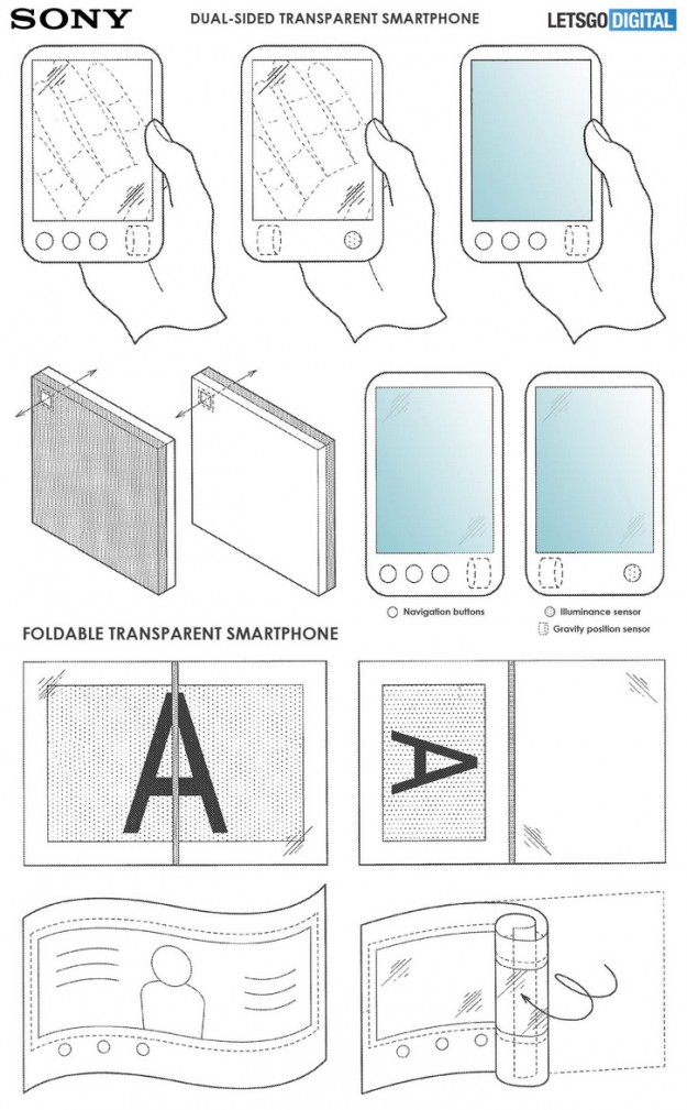 Sony патентует складной прозрачный смартфонВ конце ноября опубликована патентная документация на технологию прозрачного смартфона Sony. В патенте описывается девайс с двумя дисплеями, расположенных «спина к спине», которые могут работать в различных режимах прозрачности: в прозрачном, полупрозрачном и непрозрачном для каждого дисплея. С помощью гироскопа устройство способно определять, с какой стороны смартфон используется в данный момент, а датчик освещения будет помогать в автоматической регулировке прозрачности. Пользователь по желанию сможет сам изменять степень прозрачности дисплея.