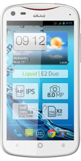 Новая модель Liquid E2 отличается от предшественника более производительным четырехъядерным процессором, обновленной 8-мегапиксельной фотокамерой и значительно более емкой аккумуляторной батареей, обеспечивающей повышенное время автономной работы. «Под капотом» смартфона Acer Liquid E2 — вычислительная платформа MediaTek MT6589 с четырехъядерным процессором (1,2 ГГц) и графическим ядром PowerVR SGX 544MP, поддерживающая работу с двумя SIM-картами и дополненная гигабайтом оперативной памяти. Благодаря этому смартфон Liquid E2 демонстрирует отличную производительность, достаточную для практически любых задач — от просмотра сложных веб-страниц до работы геонавигационных приложений в режиме реального времени, от просмотра потокового видео до непрерывной фотосъемки сериями по несколько десятков кадров. И все это — без каких-либо задержек реакции интерфейса Android на действия пользователя.