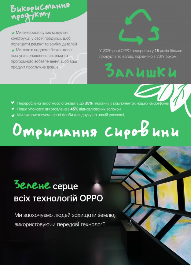 В качестве вклада в экономику замкнутого цикла в 2020 году компания OPPO переработала в 13 раз больше продуктов, чем в 2019 году. Переработанный пластик составляет 35 % пластического материала, из которого сделаны элементы смартфонов. Общие отходы производства уменьшились на 42,7 %, а косвенные выбросы парниковых газов — на 20 %.