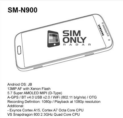 Спецификации и эскизы дизайна Samsung Galaxy Note III уже в СетиВеб-ресурс SIMOnlyRadar опубликовал эскизы дизайна и технические характеристики не анонсированного еще Galaxy Note III от Samsung.