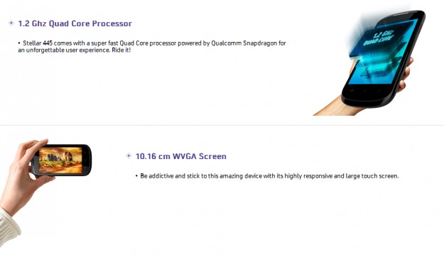 Главной особенностью аппарат, правда, актуальной лишь для жителей Индии, является поддержка им сразу нескольких региональных индийских языков. Кроме того, он получил от производителя экран диагональю 4 дюйма с разрешением 800x480 пикселей, 4-ядерный процессор с тактовой частотой 1.2 ГГц, 512 МБ оперативной памяти и 4 ГБ встроенной, которую можно расширить с помощью microSD-карт объемом до 32 ГБ.