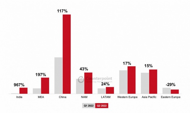 Поки ринок смартфонів загалом продовжує падати, ринок складних смартфонів зростає. Аналітики Counterpoint стверджують, що в першому кварталі 2023 року він зріс на значні 64%, до 2,5 млн одиниць. Продажі таких апаратів зросли майже на всіх великих ринках, крім східної Європи. Найсильніше продажі підскочили в Китаї (117%), на Близькому Сході та в Африці (197%), а також в Індії (967%). У кількісному вираженні, звичайно, лідирує Китай, причому кратно перевершуючи будь-який інший ринок.