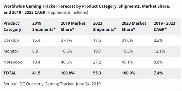 По итогам 2019 года в целом, как ожидается, продажи игровых настольных компьютеров составят 15,4 млн штук, игровых ноутбуков — 19,4 млн. Отгрузки мониторов игрового класса достигнут 6,8 млн единиц.