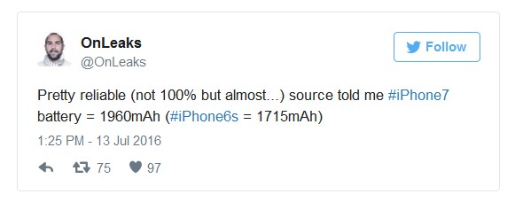 Стала известна емкость батареи Apple iPhone 7Китайский "масте утечек" @OnLeaks сообщил новые подробности о готовящемся к анонсу на сентябрь смартфоне Apple iPhone 7, в частности касающиеся его аккумулятора. По словам источника, на борту будущей новинки "яблочного" производителя будет установлена батарея на 1960 мАч, что на 14% превышает емкость аккумулятора его предшественника iPhone 6S. Можно предположить, что и 5.5-дюймовой Plus-версии iPhone 7 достанется батарея большего объема, нежели у iPhone 6S Plus.
