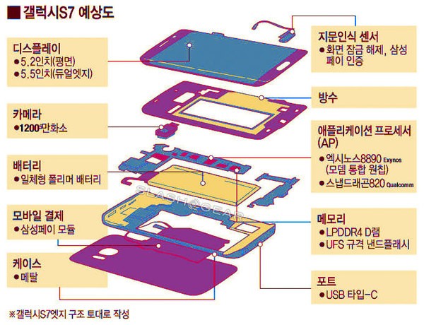 Стали известны новые подробности о флагманах Galaxy S7 и S7 edgeАнонимный источник сообщил одному из корейских изданий новые подробности о готовящихся к анонсу флагманах Samsung Galaxy S7 и S7 edge. Более того, он поделился изображением, демонстрирующим конструкцию корпусов и основные аппаратные элементы будущих новинок. Итак, если верить утечке, Galaxy S7 и S7 edge будут оснащены Super AMOLED экраном с разрешением 2560х1440 пикселей и распознаванием силы нажатия, чипсетом Qualcomm Snapdragon 820 или Samsung Exynos 8890, 4 ГБ оперативной памяти LPDDR4 и 16/32/64 ГБ расширяемой встроенной.