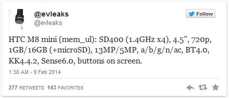Стали известны спецификации мини-флагмана HTC M8 miniИзвестный своими публикациями о неанонсированных устройствах twitter-аккаунт @evleaks опубликовал спецификации не представленного еще официально смартфона HTC M8 mini — мини-версии будущего флагмана HTC M8, известного также как HTC One+.