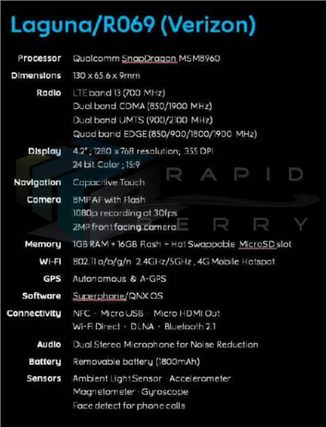 Стали известны спецификации смартфона BlackBerry LagunaБуквально на днях в Сети засветились спецификации нового смартфона BlackBerry Laguna под управлением ОС BlackBerry 10. Известно, что новый смартфон построен на базе чипа Qualcomm Snapdragon MSM8960, а также гигабайта оперативной памяти и 16 ГБ встроенной пользовательской. Диагональ дисплея 4,2-дюйма, а разрешение 1280х768 точек, при плотности 350 dpi и соотношении сторон 15:9. Кроме того, BlackBerry Laguna обладает 8 Мп камерой, а также поддерживает Wi-Fi 802.11 a/b/g/n, aGPS, NFC, MicroUSB, Micro HDMI и мн. др.