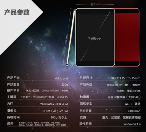 Vidaa Pad оснащен 7.85-дюймовым дисплеем с разрешением 2048х1536 пикселей, 4-ядерным процессором Rockchip RK3288 с тактовой частотой 1.8 ГГц и графикой Mali-T768, 2 ГБ оперативной памяти и 16 ГБ встроенной, которую можно расширить с помощью карт памяти формата microSD.