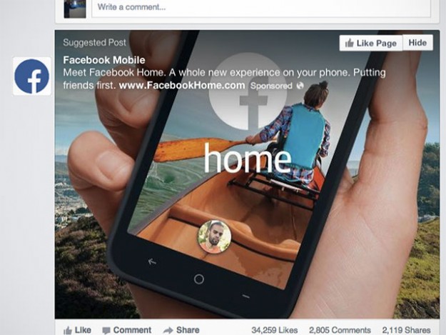 Стартовала рекламная кампания Facebook, нацеленная на продвижение оболочки HomeКак помним, 12 апреля компания Facebook запустит новую оболочку Home. А вот буквально вчера стало известно о том, что Facebook начала масштабную рекламную компанию нового лаунчера едва ли не на всех своих настольных и мобильных ресурсах.