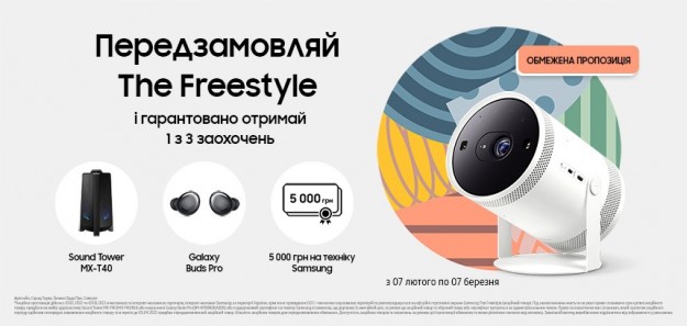 Стартует предварительный заказ на портативный экран Samsung The Freestyle – успейте первыми и получите 1 из 3 подарковSamsung Electronics сообщает, что с 7 февраля в Украине начинается предварительный заказ революционной новинки The Freestyle. Этот уникальный девайс сочетает в себе проектор, смарт-ТВ, смарт-колонку и устройство, способное создавать декоративное освещение – и все это в одном легком и портативном корпусе. Покупателей, успеющих первыми заказать The Freestyle, ждет приятный бонус на выбор: аудиосистема Sound Tower MX-T40, беспроводные наушники Galaxy Buds Pro или 5 тыс. грн на покупку техники Samsung. И поторопитесь – предложение ограничено!