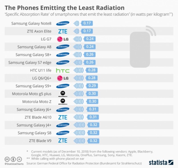 Statista опубликовала рейтинг самых вредных для здоровья смартфоновSAR — это удельный коэффициент поглощения электромагнитной энергии в тканях человеческого тела за одну секунду с единицей измерения ватт на килограмм (Вт/кг). Данным показателем принято определять уровень вредного воздействия мобильных телефонов, и во времена, когда сотовая связь только становилась частью повседневной жизни, на него обращали больше внимания, чем сейчас. Тем не менее, по-прежнему составляются рейтинги смартфонов по уровню излучения: к примеру, такую статистику ведёт аналитическая компания Statista. На днях она опубликовала результаты своего последнего исследования в этой области, в котором использовала данные немецкого ведомства по радиационной защиты (Bundesamt f?r Strahlenschutz).