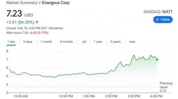 Стоимость акций производителя беспроводных зарядок Energous почти удвоилась на фоне слухов о партнерстве с AppleВ ходе пятничных торгов акции компании Energous, занимающейся производством беспроводных зарядных станций WattUp, в которых используются радиочастоты для увеличения радиуса действия, выросли на 94,35 %, до $7,23 за одну ценную бумагу. Такому взлёту способствовала новость о том, что Energous совместно с Apple занимается разработкой беспроводного магнитного аккумулятора для мобильных устройств.
