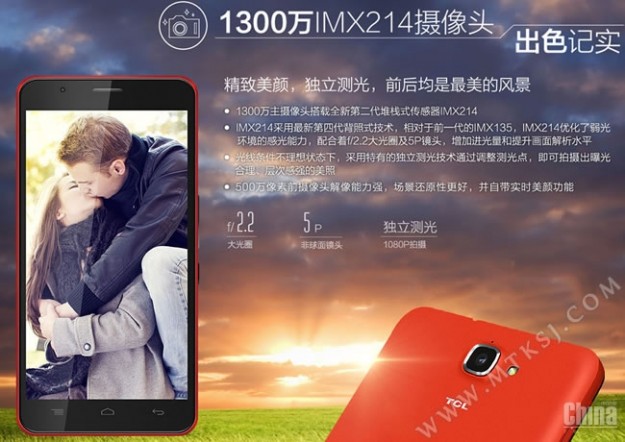 Новинка оснащена 5.5-дюймовым IPS-дисплеем с разрешением 1280х720 пикселей, 8-ядерным процессором MediaTek МТ6592М с тактовой частотой 1,4 ГГц, 1 ГБ оперативной памяти и 8 ГБ встроенной, которую можно расширить с помощью карт памяти формата microSD. В наличии аппарата также аккумулятор емкостью 3300 мАч, 5Мп фронтальная камера и 13Мп основная Sony IMX214, беспроводные модули Wi-Fi 2.4/5 ГГц и Bluetooth, поддержка USB-OTG-сопряжения. Толщина корпуса девайса составляет 7.95 мм, а вес 145 грамм.
