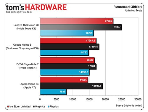 А вот на днях появились первые «живые» результаты. Чип прошел тесты в 3DMark, по итогам, которых стало известно, что эта платформа NVIDIA, по меньшей мере, на 25% мощнее популярного Snapdragon 800 и 64-битного процессора Apple A7. Однако, учитывая тот факт, что K1 во время тестирования работала не на максимальной тактовой частоте, вполне возможно, что показатели могут быть и выше.