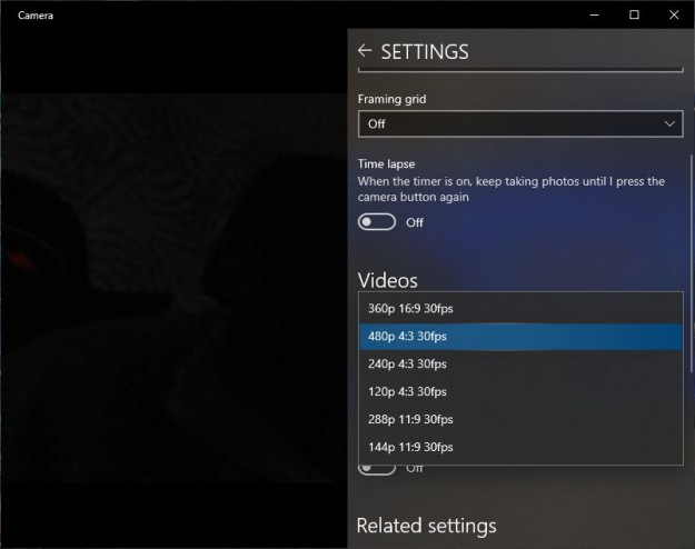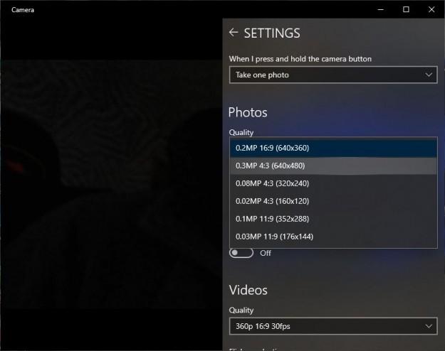 Якість зйомки фото та відео можна зменшити, це видно на скріншоті базового для Windows 10 додатка «Камера». Доступні розміри: