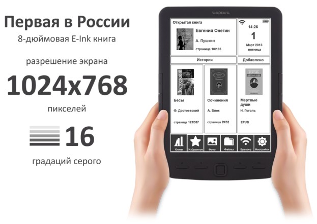 teXet TB-138 — 8-дюймовая E-Ink книга с Wi-FiteXet представляет 8-дюймовую электронную книгу с E-Ink дисплеем. Кроме удобного для чтения экрана, новинка располагает модулем Wi-Fi, отвечающим за выход в Интернет. Устройство умеет распаковывать заархивированные файлы RAR и ZIP, поэтому приступить к чтению можно сразу после того, как книга будет загружена в память новинки. Большой по меркам E-Ink ридеров экран TB-138 с диагональю 8 дюймов и высоким разрешением 1024х768 пикселей выполнен по технологии «электронные чернила». Качественная картинка складывается из 16 градаций серого, что дает возможность не только работать с текстом, но и просматривать иллюстрации в черно-белом цвете.