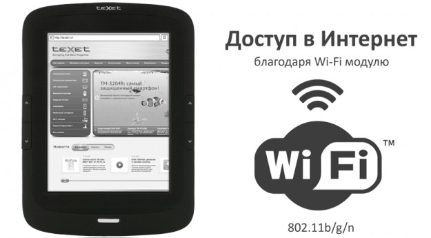 Встроенный модуль Wi-Fi открывает выход в Интернет повсюду, где есть точка доступа к беспроводной сети. Пользователи смогут просматривать сайты, читать онлайн электронные журналы и пополнять библиотеку без подключения к компьютеру. Устройство без проблем справляется с заархивированными файлами RAR и ZIP: после загрузки распакованные произведения сразу же появляются на рабочем столе. Как и большинство электронных книг teXet, новинка работает с внушительным количеством текстовых форматов, в том числе с самыми востребованными DOC и DJVU, воспроизводит изображения (JPG, BMP, GIF, PNG).