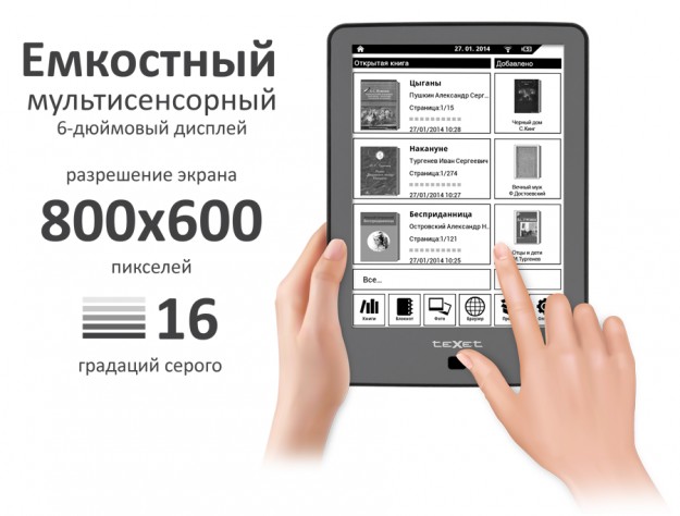 teXet TB-176FL - новый букридер с сенсорным дисплеемКомпания teXet пердставила новую электронную книжку - TB-176L с 6-дюймовым дисплеем и светодиодной подсветкой. Ридер оснащен сенсорным E-ink экраном диагональю 6 дюймов с разрешением 600x800 пикселей, а такде 4 ГБ внутренней памяти, которую можно расширить с помощью microSD/SDHC карт до 32 ГБ. Для подключения к сети интернет в новинке предусмотрен Wi-Fi модуль (802.11b/g/n).