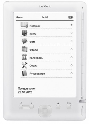 teXet TB-406: стильный ридер в бюджетном сегментеДисплей с диагональю 6 дюймов с разрешением 800?600 пикселей выполнен по технологии «электронные чернила», которую отличает высокая четкость воспроизводимо текста. Чтение не вызывает напряжения глаз, а низкое энергопотребление гарантирует продолжительное время работы – до нескольких недель активного использования ридера – на одном заряде аккумулятора.