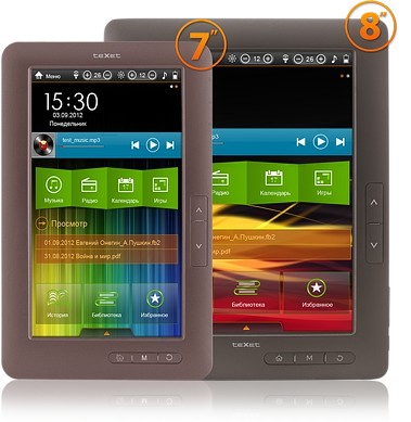 teXet TB-780HD и TB-880HD: тонкие мультимедийные TFT-ридерыПредставленные электронные ридеры – одни из самых тонких в ассортиментном ряду teXet. Толщина 7-дюймовой модели составляет всего 9,4 мм, а книги с дисплеем 8 дюймов – 11 мм. Стильные металлические корпуса исполнены в двух цветовых вариациях: серый и бронза. Ридеры teXet работают с самыми популярными форматами текста, в числе которых DOC и DJVU. Меню настроек имеет достойный набор опций для комфортного чтения: поворот текста на 90, 180 и 270 градусов, автоматический режим просмотра, выбор цвета, размера и кодировки шрифта, сохранение/удаление закладок, поддержка оглавления и сносок в тексте и сортировка файлов по названию.