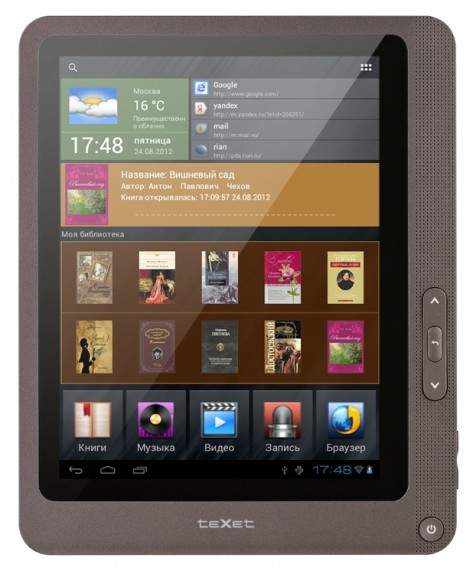teXet TB-823A: ридер с Android 4.0 в металлическом корпусеКнига работает на процессоре Boxchip A13 Cortex A8, тактовая частота 1,2 ГГц, и актуальной версии OS Android 4.0.3, благодаря чему TB-823A воспроизводит не только самые популярные форматы электронных книг, но и аудио, видео и графику. Модель оснащена большим сенсорным 8-дюймовым дисплеем с поддержкой технологии 5 point Multi-touch. Для полноценного доступа в Интернет предусмотрен модуль WiFi 11b/g/n. В случае если объема внутренней памяти (4 ГБ) будет недостаточно, его легко расширить с помощью microSD/SDHC карты до 16 ГБ.