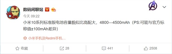 Топ-менеджер Xiaomi раскрыл основные характеристики двух версий Mi 10Несколько дней назад в Сети появились слухи о том, что Xiaomi Mi 10 получит аккумулятор большой емкости, не менее 4500 мА·ч. Сегодня эти данные прокомментировал в социальной сети Weibo директор по новой продукции Xiaomi Ван Тенг Томас (Wang Teng Thomas).