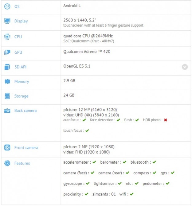 Больше фото здесь. GFXBench "подтвердил" 2K-дисплей, 3 ГБ ОЗУ и Snapdragon 805 для Nexus 6 Судя по появившимся данным, смартфон Nexus 6 будет обладать следующим «железом»: 5,2-дюймовый дисплей с разрешением 2560х1440 пикселей, 4-ядерный процессор Snapdragon 805 с тактовой частотой 2,65 ГГц и графикой Adreno 420. Кроме того, здесь окажется 3 ГБ оперативной памяти и 32 ГБ встроенной, а также 13Мп основная камера с LED-вспышкой, системой автофокусировки и возможностью записи Full HD-видео.