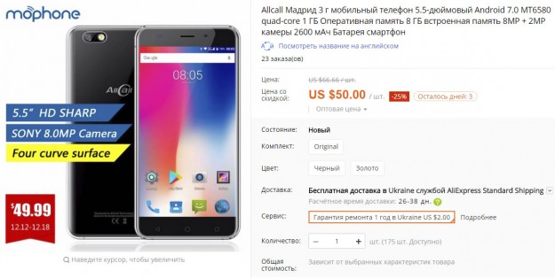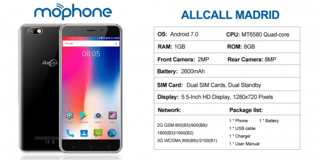 Товар дня: AllCall Madrid за $49.99!AllCall запускает в предпродажу свой первый смартфон с 4-мя скругленными гранями. AllCall Madrid будет доступен только в магазине Mophone Tech Store на Aliexpress с 12 декабря по 18 декабря (по американскому времени) 2017 года с ценником в $49.99, что на 10 долларов дешевле розничной цены. Купить AllCall Madrid: https://ru.aliexpress.com/item/Allcall-3-5-5-Android-7-0-MT6580/32841512877.html AllCall Madrid является также самым конкурентоспособным смартфоном в линейке продуктов AllCall в этом году. Оснащен 5,5-дюймовым дисплеем с HD разрешением производства SHARP. За фото возможности отвечает 8-мегапиксельная камера SONY с улучшенной портретной съемкой. Эффект съемки с SLR-эффектом достигается при помощи эффекта размытия на программном уровне. Фронтальная камера - 2-мегапиксельная. За вычисления отвечает процессор MediaTek MTK6580A, 1 ГБ оперативной памяти, 8 ГБ встроенной памяти, которую можно расширить до 32 ГБ. За автономность отвечает батарея на 2600 мАч, которой достаточно на день пользования. Работает гаджет на Android 7.0 Nougat и позволяет устанавливать сразу две SIM-карты.