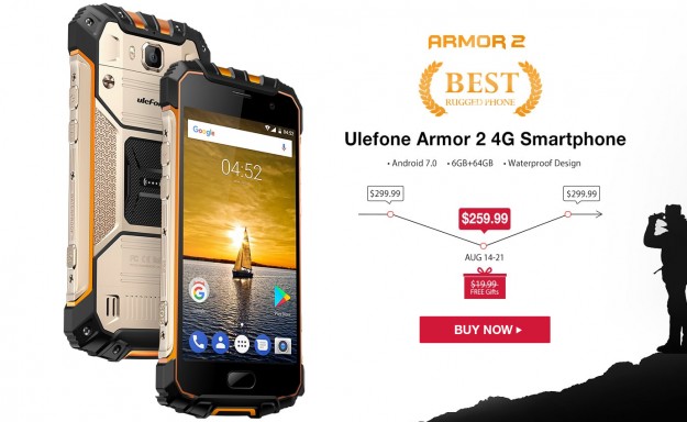Ulefone Armor 2 от $259.99 С 14 по19 августа внедорожный Ulefone Armor 2 будет доступен покупателям по цене $259,99. Стандартный ценник на эту трубку составляет $299.99.