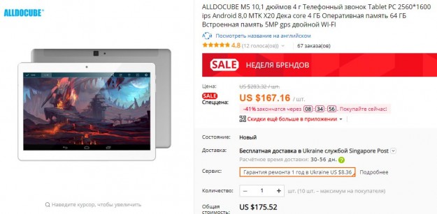 ALLDOCUBE X1 - $194.28 (скидка 33%) Ну и напоследок, пользователям предлагается приобрести планшет ALLDOCUBE X1. Это компактный планшет с функцией голосовых звонков, оснащённый 8,4" дисплеем с разрешением 2560x1600 пикселей, 10-ядерным процессором MTK X20(MT6797), 13 Мп и 8 Мп камерами на тыльной и лицевой панелях, 4 Гбайт ОЗУ, 64 Гбайт флеш-памяти и батареей на 4500 мАч.