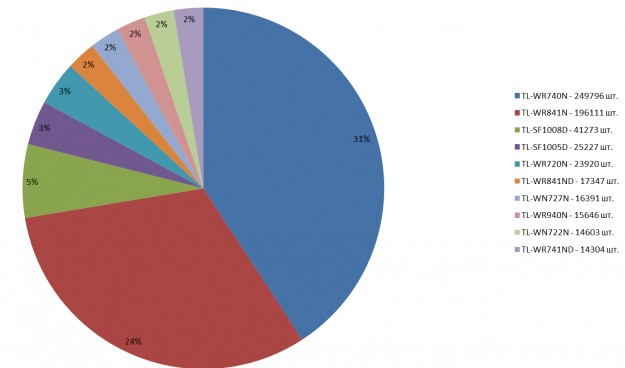 На сегодня TP-LINK является лидером в сегменте беспроводных устройств и в мире, и в Украине. В нашей стране доля рынка у бренда составляет 68% в своем сегменте (данные на основе к-ва продаж у официальных дистрибьюторов сетевых устройств). Из почти миллиона проданных устройств 72% приходится на беспроводные устройства. Полная картина выглядит так: