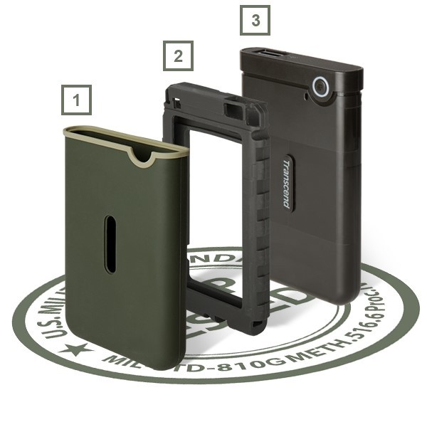 Трехступенчатая защита от ударов соответствует военным стандартам США защиты от ударов и падений, и гарантирует высокий уровень безопасности хранимой информации.