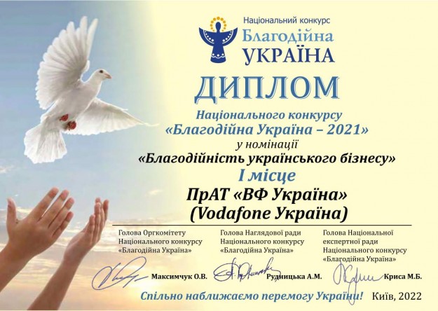 Переможцем національному конкурсі благодійництва «Благодійна Україна - 2021» став благодійний проєкт Vodafone «Добра справа в подарунок». Ідея проєкту полягає в тому, що кошти, які раніше планувалися для придбання подарунків клієнтам на свята, а також за рахунок бонусів, що обміють клієнти на благодійність за програмою лояльності Vodafone Bonus, Vodafone направляє на допомогу дітям, які потребують термінової операції з усунення вродженої вади серця. Після хірургічного втручання діти отримують можливість жити здоровим повноцінним життям.