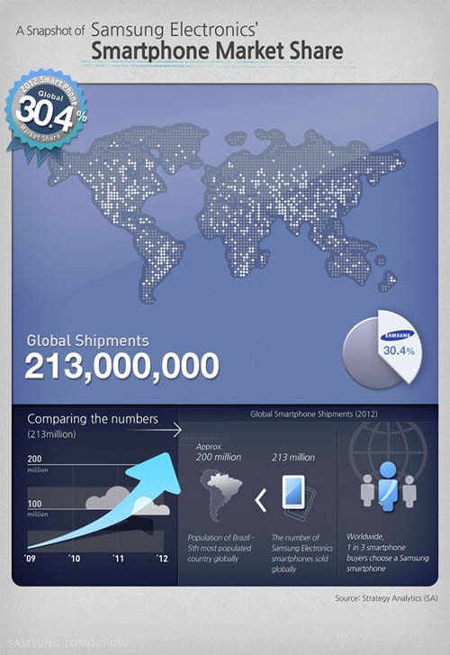 Треть мировых поставок смартфонов в 2012 году за SamsungНесмотря на то, что представители корейской компании Samsung фактически никогда не комментируют объемы поставок своих смартфонов, на днях на сайте производителя появилась весьма интересная инфографика, которая наглядно рассказывает о положении дел на мировом рынке смартфонов. Так, самые внимательные врядли не заметят, что в прошлом году Samsung поставила 213 млн. смартфонов. Для сравнения эта отметка – это на 13 млн. больше чем все население такой страны как Бразилия.