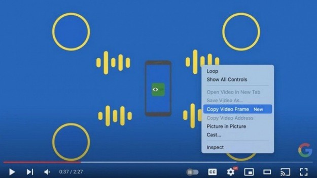 У браузері Google Chrome тепер можна скопіювати кадр із відеоУ браузері Google Chrome з'явилася функція, яка дає змогу безпосередньо скопіювати кадр із відео - "Копіювати відеокадр" ("Copy Video Frame"). Тепер немає необхідності створювати скріншот відео, що часто супроводжується отриманням картинки низької якості та ще й з панеллю відтворення. Щоб скористатися цією можливістю в YouTube, потрібно призупинити відео, зробити два клацання правою кнопкою миші і вибрати в меню, що з'явилося, пункт "Копіювати відеокадр".